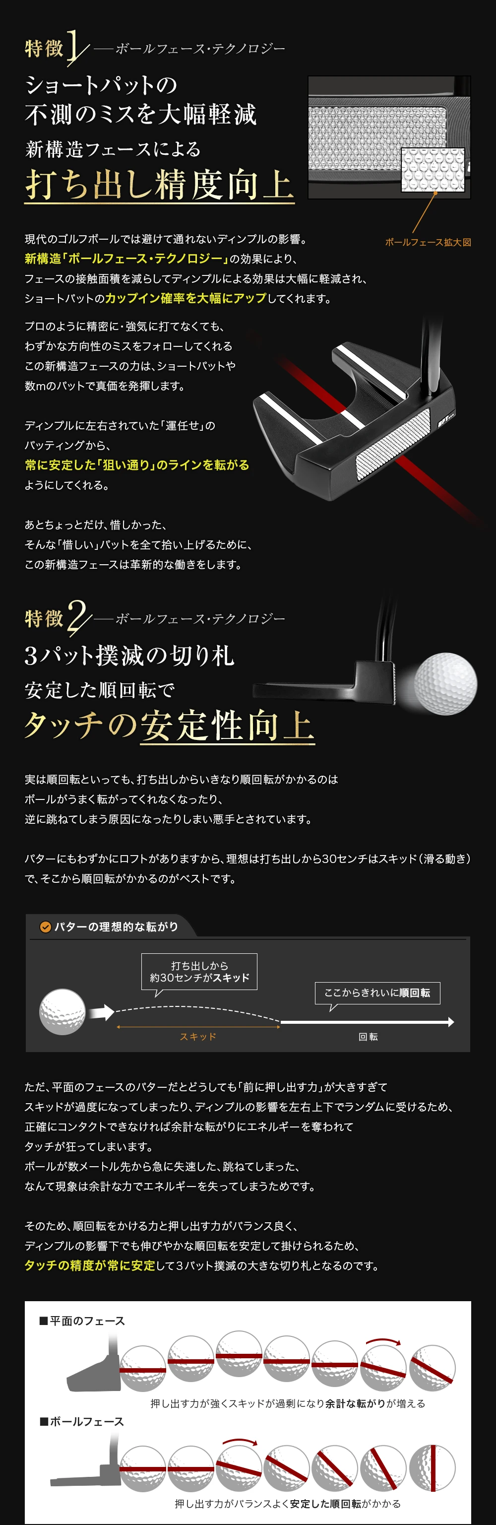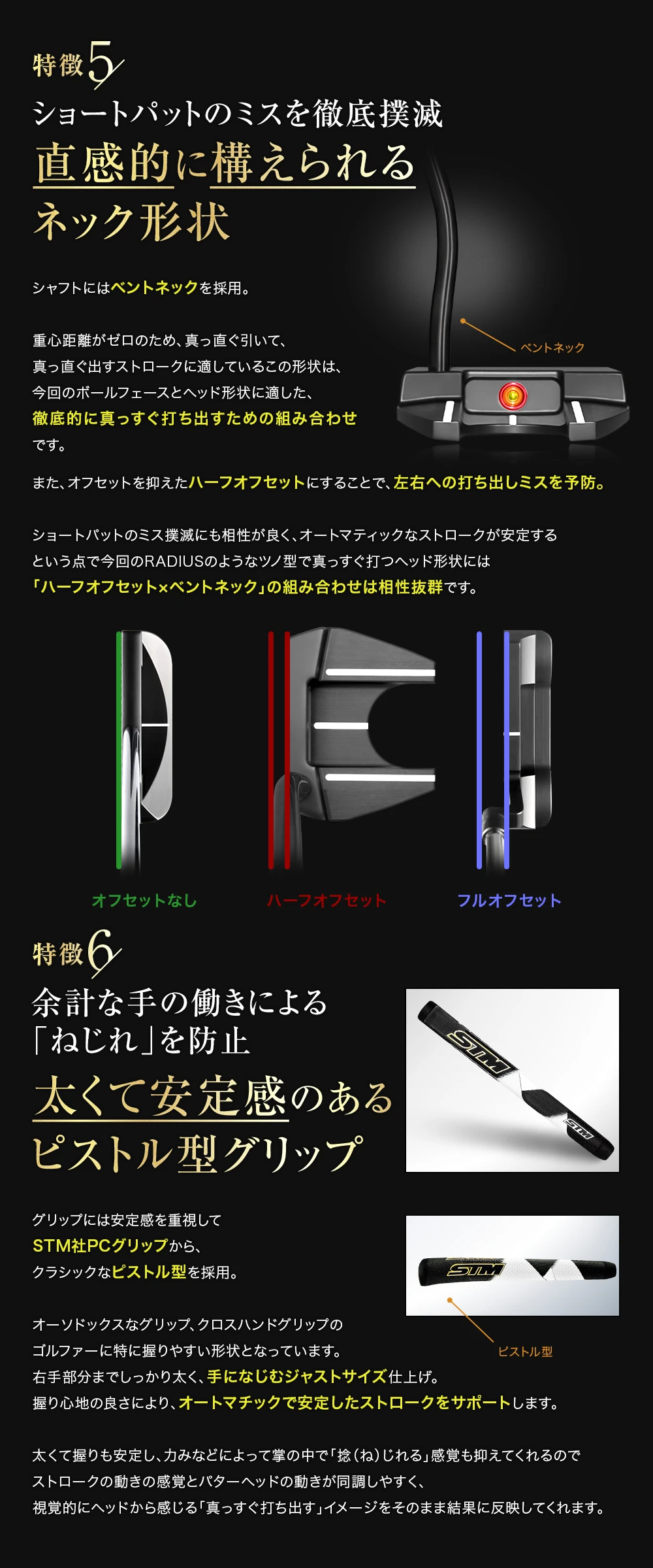 Performance 性能/特徴 現代のゴルフボールでは避けて通れないディンプルの影響。 新構造「ボールフェース・テクノロジー」の効果により、フェースの接触面積を減らしてディンプルによる効果は大幅に軽減され、ショートパットのカップイン確率を大幅にアップしてくれます。 プロのように精密に・強気に打てなくても、わずかな方向性のミスをフォローしてくれるこの新構造フェースの力は、ショートパットや数mのパットで真価を発揮します。 ディンプルに左右されていた「運任せ」のパッティングから、常に安定した「狙い通り」のラインを転がるようにしてくれる。 あとちょっとだけ、惜しかった、そんな「惜しい」パットを全て拾い上げるために、この新構造フェースは革新的な働きをします。 実は順回転といっても、打ち出しからいきなり順回転がかかるのはボールがうまく転がってくれなくなったり、逆に跳ねてしまう原因になったりしまい悪手とされています。 パターにもわずかにロフトがありますから、理想は打ち出しから30センチはスキッド(滑る動き)で、そこから順回転がかかるのがベストです。 ただ、平面のフェースのパターだとどうしても「前に押し出す力」が大きすぎてスキッドが過度になってしまったり、ディンプルの影響を左右上下でランダムに受けるため、正確にコンタクトできなければ余計な転がりにエネルギーを奪われてタッチが狂ってしまいます。 ボールが数メートル先から急に失速した、跳ねてしまった、なんて現象は余計な力でエネルギーを失ってしまうためです。 順回転をかける力と押し出す力がバランス良く、ディンプルの影響下でも伸びやかな順回転を安定して掛けられるため、タッチの精度が常に安定して3パット撲滅の大きな切り札となるのです。 特に練習時間の取りにくいゴルファーにとっては、ストローク以上に「目標に常に真っすぐ構える」ことが出来ていないことが大きな問題となります。RADIUSパターでは、特に視覚効果として「真っすぐ構えられる」事を重視したヘッド形状とターゲットラインを採用しました。 2本のツノがあることで目標に対して真っすぐ構えやすく、2本のターゲットラインも視覚的に細かな構えの違いを補正してくれます。 また、後方に伸びた2本のツノによって慣性モーメントが高まるので、当然ながら、真っすぐ打つという性能をより安定させてくれます。 その上で、重心がフェース側にあるため、ブレード型のようなフィーリング性能も備わっている、ブレード型とマレット型の良いとこ取りをしたパターとなっています。 ヘッド本体は362gのやや重めの設定で、CNC加工によって1個ずつ丁寧に製造。本来インサート入りのパターなら生産効率の良い鋳造でも問題はありませんが、RADIUSでは精密な重心設計のためにあえて品質のCNC加工を採用。これによってインパクト時に伝わる打感の良さを高めるだけでなく、精密な重心設計を可能にしました。 また、最も特徴的なのがソール底部の凹みです。 後方に重量を増すことで慣性モーメントを高めてオートマティックなストローク性能を持たせながら、ソール下部の余計な重量は排除。パターでは必ずしも低重心であれば良いわけではないので、順回転のかけやすさ、ストロークのしやすさのバランスを追求した最適な設計をCNCならではの精密な加工で実現しています。 重心距離がゼロのため、真っ直ぐ引いて、真っ直ぐ出すストロークに適しているこの形状は、今回のボールフェースとヘッド形状に適した、徹底的に真っすぐ打ち出すための組み合わせです。 また、オフセットを抑えたハーフオフセットにすることで、左右への打ち出しミスを予防。 ショートパットのミス撲滅にも相性が良く、オートマティックなストロークが安定するという点で今回のRADIUSのようなツノ型で真っすぐ打つヘッド形状には「ハーフオフセットxベントネック」の組み合わせは相性抜群です。 グリップには安定感を重視してSTM社PCグリップから、クラシックなピストル型を採用。 オーソドックスなグリップ、クロスハンドグリップのゴルファーに特に握りやすい形状となっています。 右手部分までしっかり太く、手になじむジャストサイズ仕上げ。 握り心地の良さにより、オートマチックで安定したストロークをサポートします。 太くて握りも安定し、力みなどによって掌の中で「捻(ね)じれる」感覚も抑えてくれるのでストロークの動きの感覚とパターヘッドの動きが同調しやすく、視覚的にヘッドから感じる「真っすぐ打ち出す」イメージをそのまま結果に反映してくれます。
